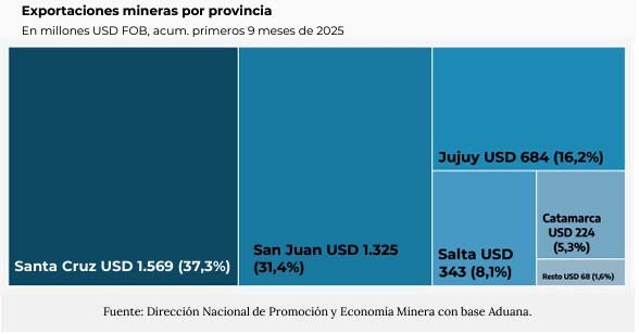 Según el informe, en septiembre de 2025 las exportaciones mineras argentinas totalizaron USD 557 millones (+34,3% interanual) y, en ese marco, Santa Cruz alcanzó USD 226 millones en ventas mineras durante el mes, el más alto registrado para septiembre en la provincia.